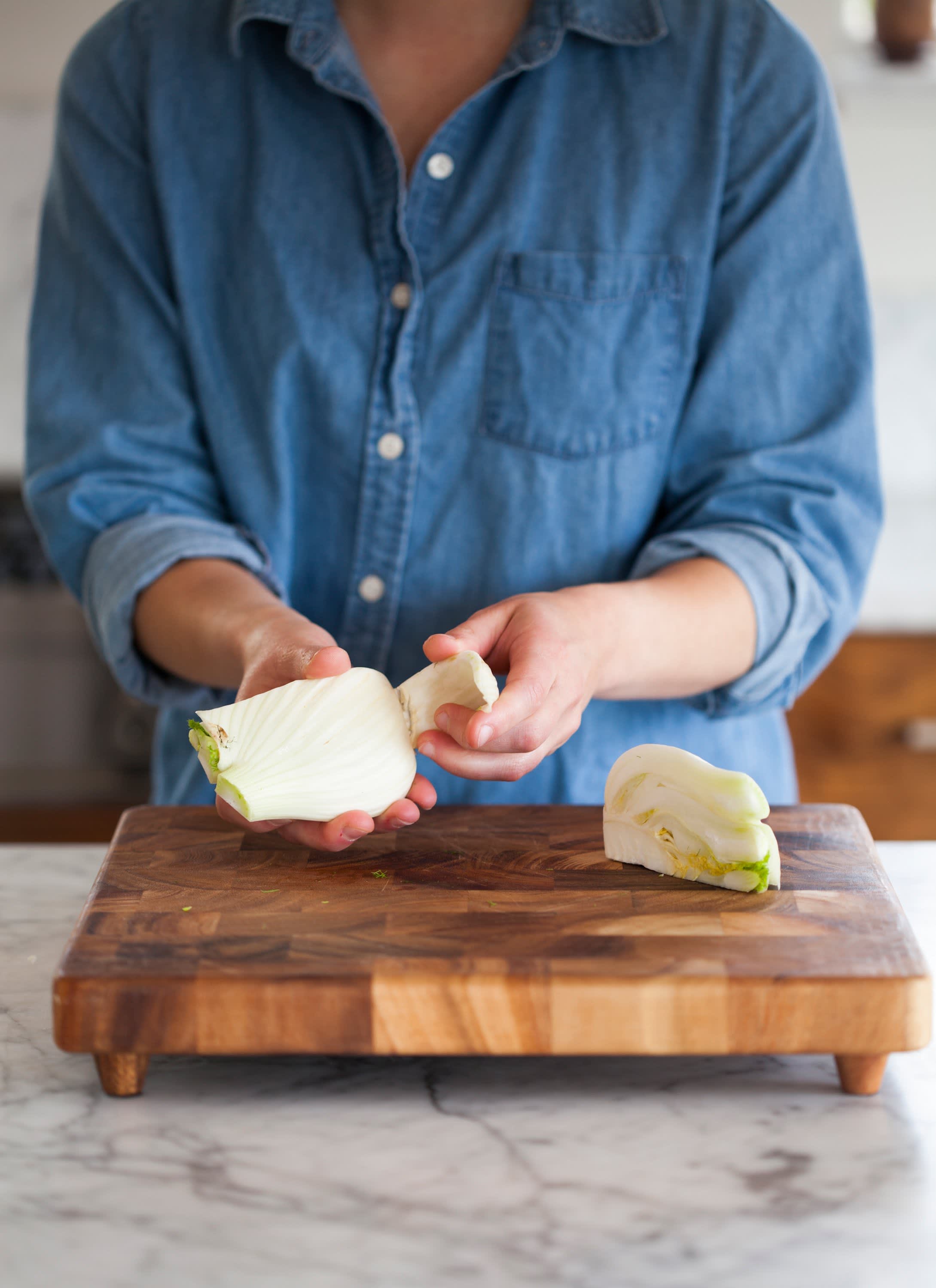 Stand the fennel up on a cutting board so it's sitting flat, then cut in half lengthwise.
